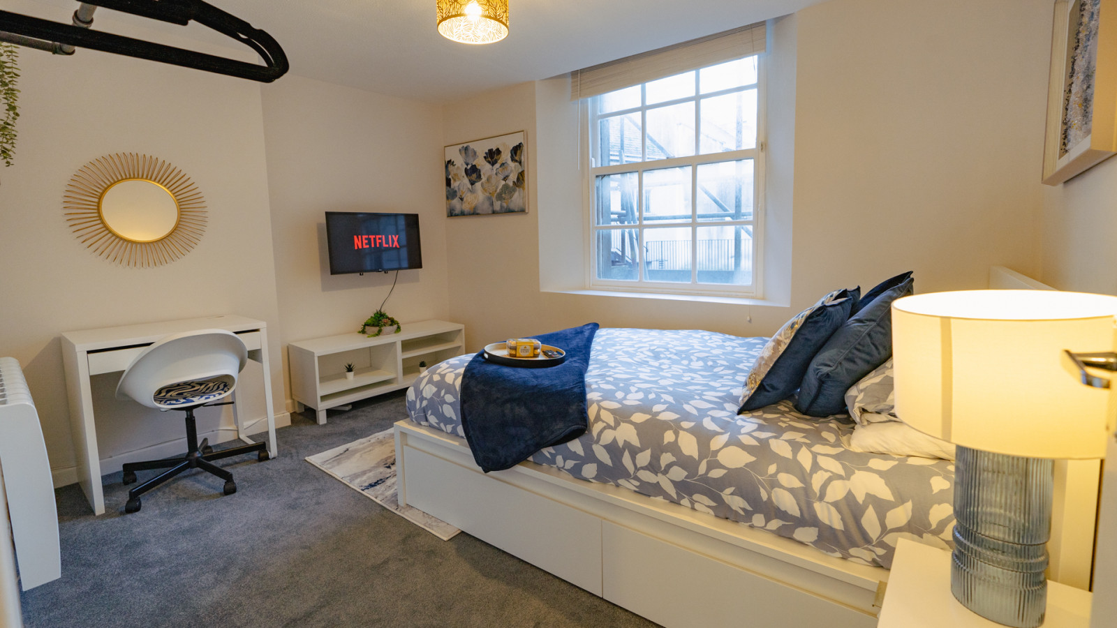 August 2025 4.50Had a great short stay Positive: Apartment was on 2nd floor. Lovely big windows, you can see some of the castle to the side. Lovely and clean, dishwasher a bonus. Washer/dryer in bathroom. Very clean. Shower a bit slow. Josh very responsive to any queries. Plenty of tea, coffee, sugar and condiments. Perfect base to explore the City. Lots of entertainment, bars, pubs, restaurants and take aways. Car parking can be expensive. We used parking apps to find cheaper parking as suggested by Josh. Noise not a problem for us. Negative: Nothing