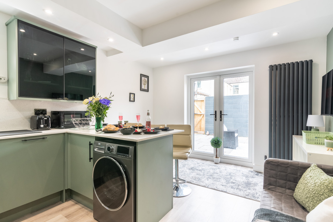 Cook up a storm in our state-of-the-art kitchen, featuring sleek sage-coloured cabinets with black matt handles, a gas hob, an electric oven, an integrated fridge freezer, and a freestanding washing machine. The kitchen is equipped with everything you need for your short-term stay.